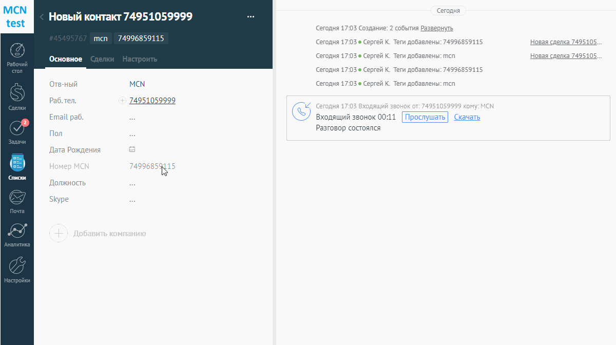 Объединение Виртуальной АТС и amoCRM в одном сервисе позволяет более эффективно взаимодействовать с клиентами: совершать звонки в один клик, показывать карточку клиента при входящем звонке. Сотрудник видит, кто звонит, и какая сделка открыта.